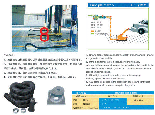 震,抗腐蝕等良好的抗化學性;3、超高溫吸咀,自帶夾緊裝置,捕獲尾氣不泄露;4、采用ABB技術生產中壓離心式風機,低噪音,能耗小,風量大;